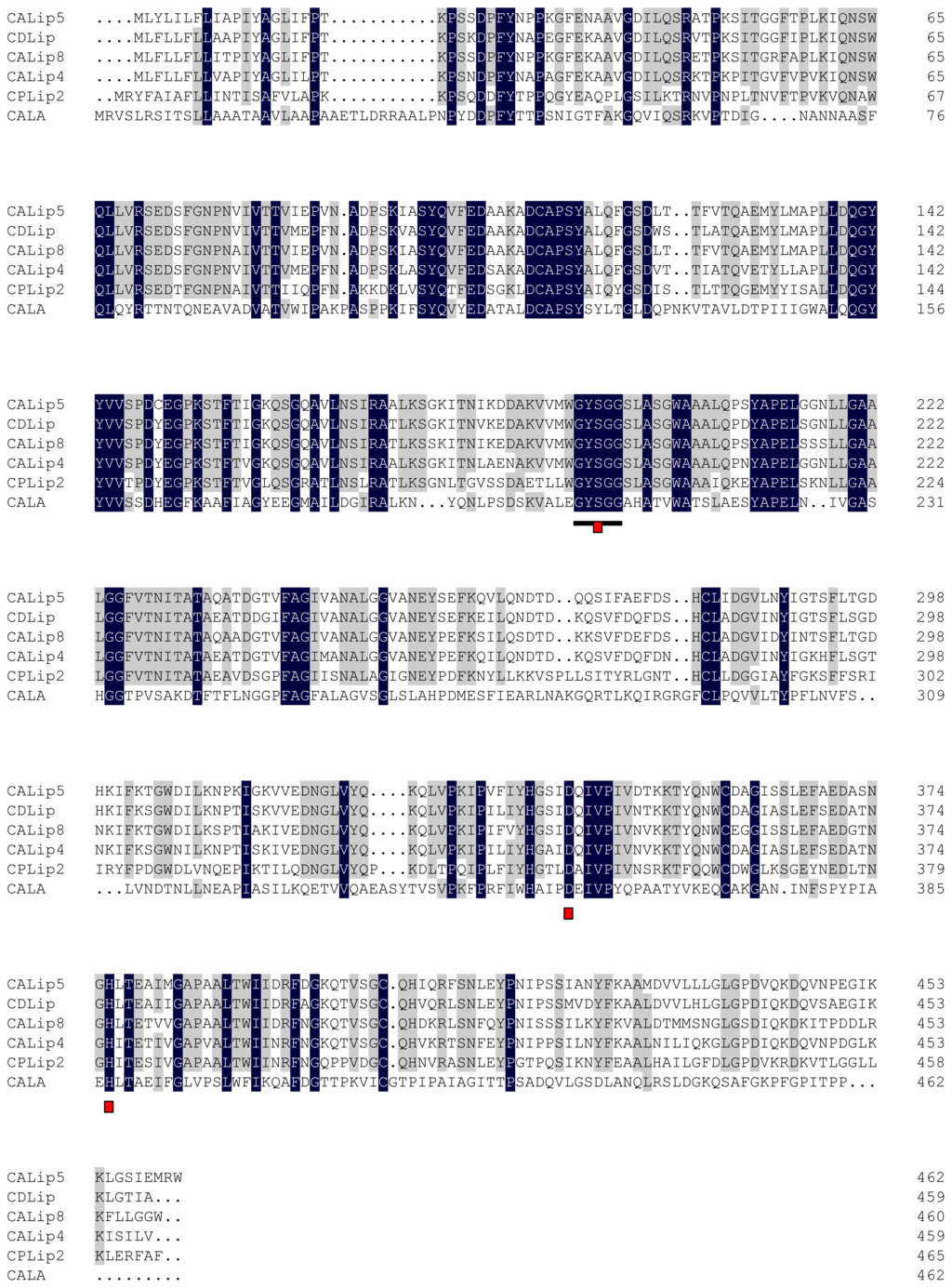 Figure 1. Multiple alignment of Lip5-DM (CALip5) amino acids sequence (HM581681) with those of lipases from other Candida species. The lipase sequence included CDLip (putative lipase from Candidas dubliniensis CD36, XP_002421466), CALip8 (lipase 8 from Candidas albican SC5314, AAF69523), CALip4 (lipase 4 from Candidas albican SC5314, AAF69521), CPLip2 (lipase 2 from Candida parapsilosis, CAC86400) and CALA (lipase A from Candida antarctica, 3GUU_A). Gray shading reflects the degree of sequence conservation. The conserved pentapeptide (Gly-Xaa-Ser-Xaa-Gly) is underlined. The putative active sites on Lip5 sequence are marked with red rectangles.