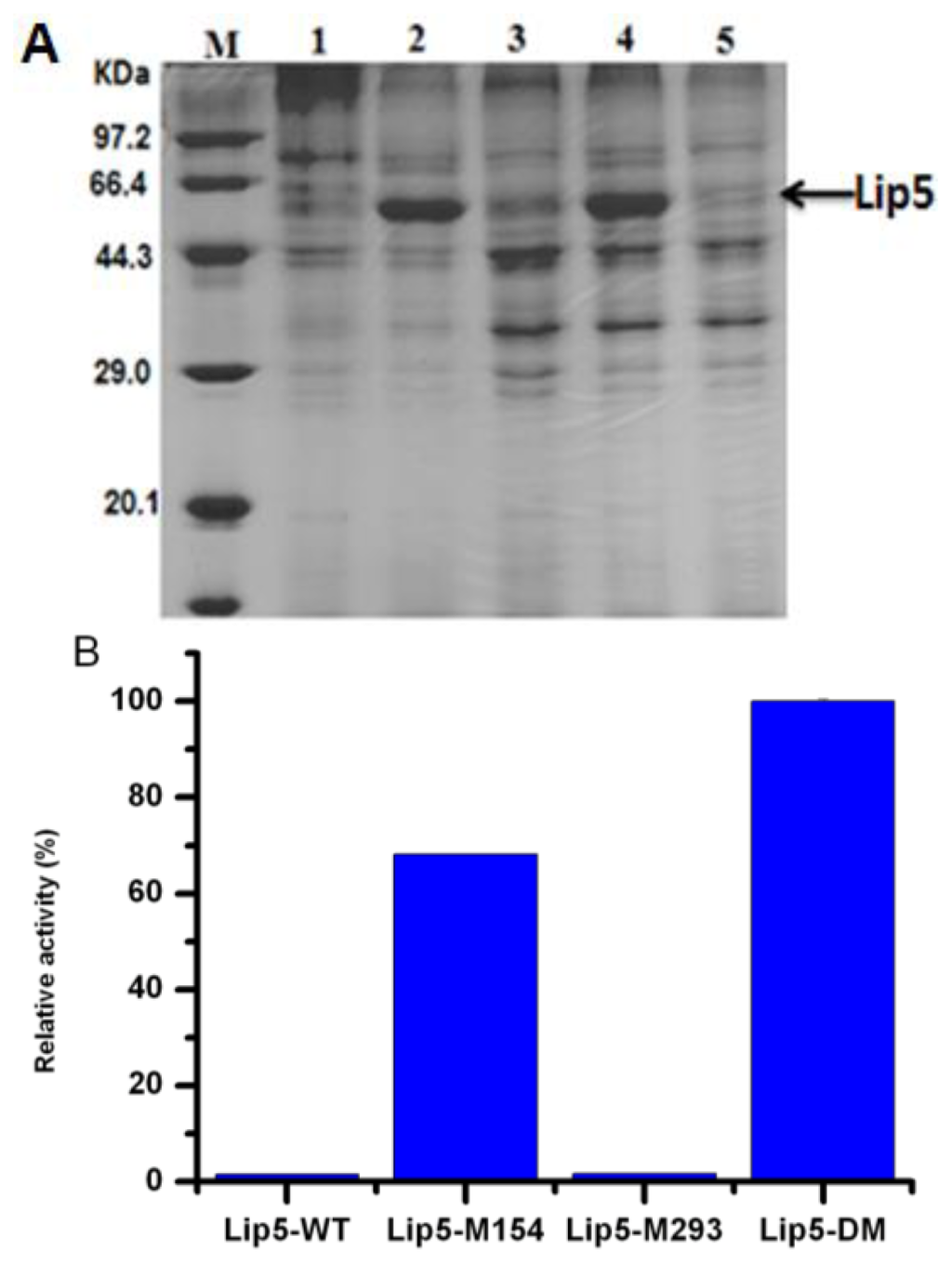 Figure 2. (A) Lane M: molecular weight marker; lane 1: Sample from wild type Lip5 expression medium; lane 2: Sample from Lip5-M154 expression medium; lane 3, sample from Lip5-M293 expression medium; lane 4: Sample Lip5-DM expression medium; lane 5: sample from transformant harboring pGAPZαA expression medium; (B) The activity of Lip5-WT and mutants in the culture supernatant were measured spectrophotometrically with p-NP-caprylate as substrate at 25 °C and pH 6.0. Activities are displayed as percentages of the maximum activity (Lip5-DM, 4000 U/L).