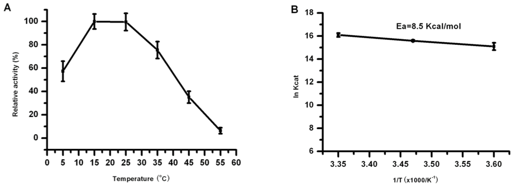 Figure 4. Effects of temperature on Lip5-DM activity: (A) The purified Lip5-DM was assayed at different temperatures. Activities are displayed as percentages of the maximum activity (31.27 U/mg). Values are means ± SD from three independent experiments; (B) To determine the activation energy, the logarithm of the Kcat values was plotted against the reciprocal of absolute temperature (T). The values shown are activation energy calculated from the Arrhenius plot.