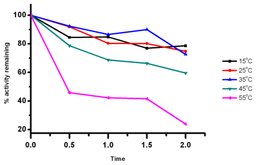 Figure 5. Effect of temperature on the recombinant lipase thermostability. The enzyme was assayed after incubation in a range of temperatures (15–55 °C) for 2 h. Activities are displayed as percentages of the initial activity (31.27 U/mg).
