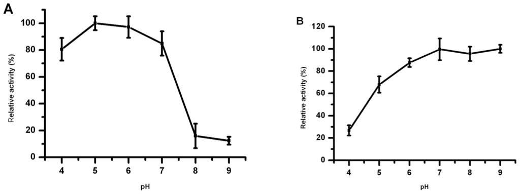 Figure 6. Influence of pH on Lip5-DM activity (A) and stability (B). The activity of purified Lip5-DM was measured at various pHs from 4.0 to 9.0. For the stability study, the lipase enzyme was investigated after incubation in a range of pH (4.0–9.0) for 12 h. Activities are shown as percentages of the maximum activity (32.17 U/mg). Values are means ± SD from three independent experiments.