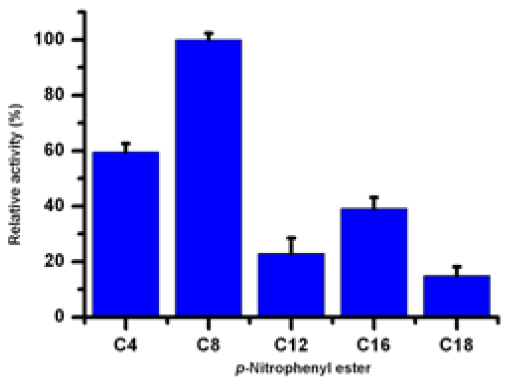 Figure 7. Relative activity of Lip5-DM on various p-nitrophenyl esters with different chain lengths. Activities on each substrate are expressed as the percentage of p-NP-caprylate (31.27 U/mg). Values are means ± SD from three independent experiments.