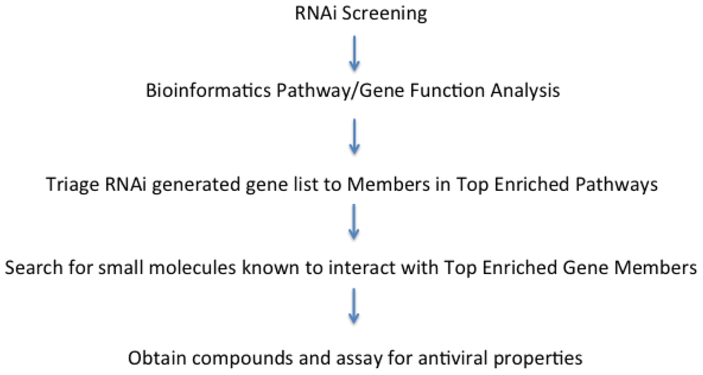 As outlined above, it is a primary function of gene databases to extract biological meaning as well as potential therapeutic host factors from a high throughput RNAi screen by means of descriptive annotations of genes common to a particular biological pathway or gene function. In the realm of antiviral drug discovery, this approach aims at identifying host cell components critical for virus replication.