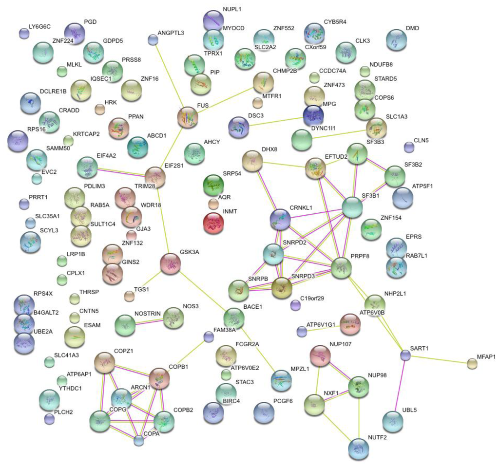 - von Mering, C; Huynen, M; Jaeggi, D; Schmidt, S; Bork, P; Snel, B. STRING: A database of predicted functional associations between proteins. Nucleic Acids Res 2003, 31, 258–261. [Google Scholar]