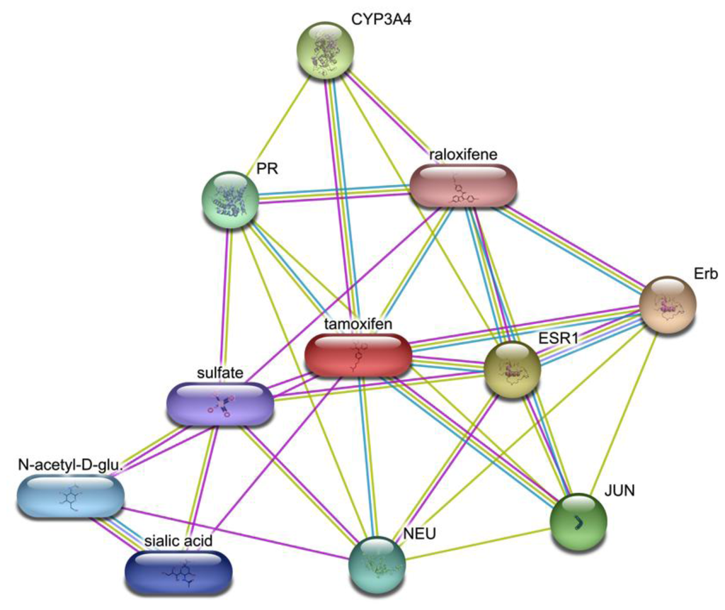 Gene interaction map overlapped with Tamoxifen via the STITCH database. The latter also connects ovals to one another suggesting that these molecules display similar biological behavior towards the same target. Edges refer to interactions as determined by experiment (purple), manual curation (cyan) or computationally predictions (yellow).