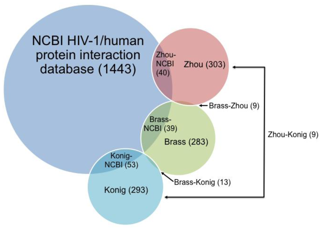 For HIV, three independent siRNA studies were published in 2008 by Brass et al. [], Konig et al. [] and Zhou et al. []. All three siRNA studies utilized the National Center for Biotechnology Information (NCBI) database of HIV-1 and human protein interactions (currently 1443 proteins identified) to evaluate the overlap of hit genes with the curated virus-host interactions available in the NCBI database []. Figure 4 illustrates the total number of genes found as well as the pairwise overlap between genes in each study. A meta-analysis of these genome-wide studies was subsequently performed by Bushman et al. in 2009 [].