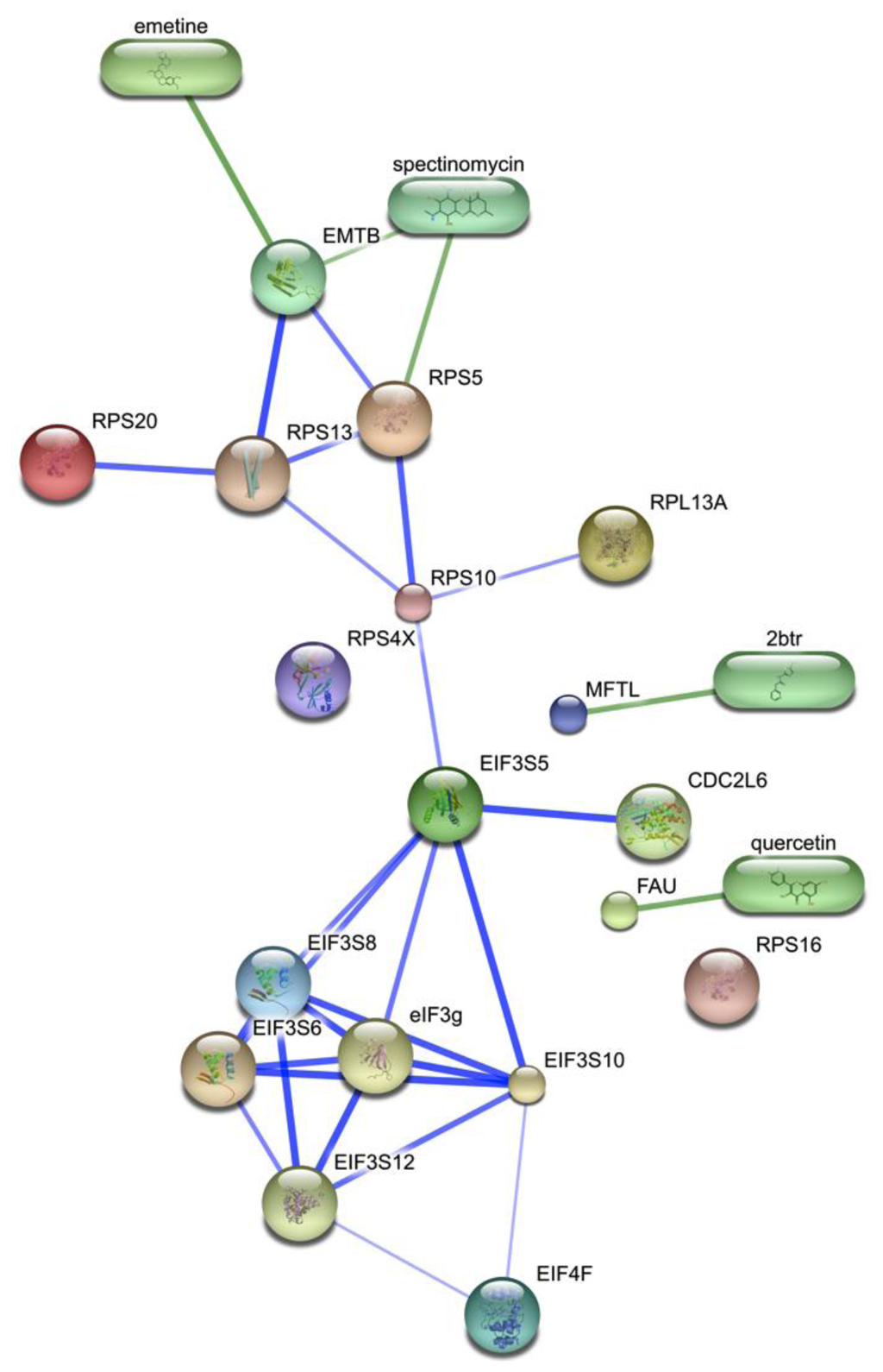 Small molecule (ovals) identification of gene products (spheres) associated with translation initiation. Green edges represent protein-ligand interactions. These compounds have not been reported previously to interfere with influenza infection, although quercetin has been demonstrated to attenuate HCV, however through a different host factor [].