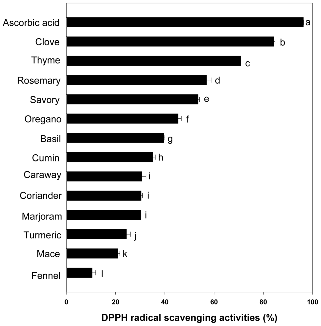 2,2-Diphenyl-1-picrylhydrazyl (DPPH) is widely used to test the ability of compounds to act as free radical scavengers or hydrogen donors, and to evaluate antioxidant activity of foods [1]. Figure 1 shows that the DPPH radical scavenging ability of the extracts can be ranked in the order clove (84.22%) > thyme (70.79%) > rosemary (56.98%) > savory (53.51%) > oregano (45.43%) > basil (39.63%) > cumin (35.02%) > caraway (30.67%), coriander (30.40%), marjoram (30.22%) > tumeric (24.43%) > mace (20.94%) > fennel (10.48%). The observed differential scavenging activities of the extracts against the DPPH system could be due to the presence of different compounds in the extract. Although the DPPH radical scavenging activities of the spices were less (p < 0.05) than those of ascorbic acid, the study revealed that most spices had free radical scavengers or inhibitors, acting possibly as primary antioxidants. In addition, a significant and linear relationship existed between the DPPH scavenging activity and phenolic content (Table 2), indicating that phenolic compounds are major contributors to antioxidant activity. The highly significant correlations obtained in this study support the hypothesis that phenolic compounds contribute significantly to the DPPH radical scavenging capacity of spice plants (r = 0.9158, p < 0.001). The good correlation between the results from total phenolics analysis and the antioxidative assays has been previously reported [19]. Moreover, Liu et al. [20] have reported the clove extract was significantly higher in the total phenol content and DPPH radical scavenging activity than other Chinese herbal plant. Although it is possible that the DPPH radical scavenging activity of spices could be mediated by individual phenolic acids, the overall antioxidant potential of spices are likely exhibited by the synergistic effect of the combinations of total phenolic acids and other antioxidant components including antioxidant vitamins considering the wide mixture of phenolic antioxidants present in spices extract.