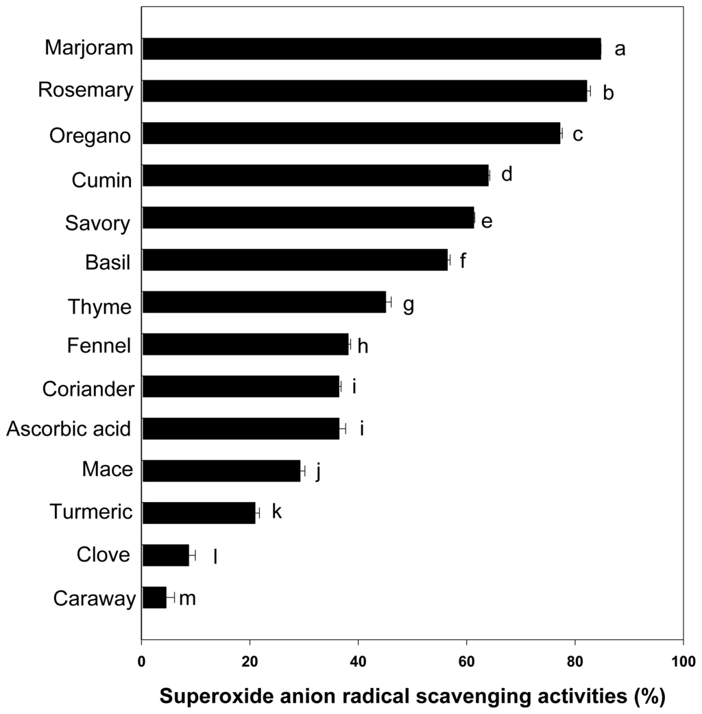 Superoxide radical scavenging activity of hot water extracts of spices at the concentration of 0.5 mg/mL (n = 6, error bars represent standard deviation). a–m Values are significantly different between the samples (p < 0.001).