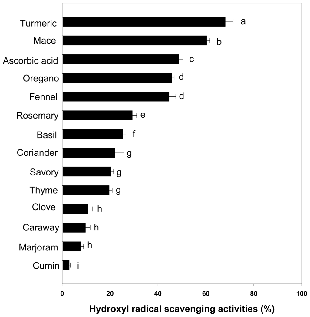 The result in decreasing order of hydroxyl radical scavenging activity was turmeric (68.09%) > mace (60.34%) > ascorbic acid (48.72%) > oregano (45.75%), fennel (44.63%) > rosemary (29.29%) > basil (25.25%) > coriander (21.94%), savory (20.43%), thyme (19.64%) > clove (10.78%), caraway (9.72%), marjoram (7.84%) > cumin (2.95%) (p < 0.001). Hydroxyl radical scavenging activity of the turmeric extract was higher than other spices extract (Figure 3). However, hydroxyl radical scavenging activity of turmeric extract showed a different pattern with different methods used such as DPPH and superoxide anion scavenging abilities. Interestingly, the antioxidant activity varies depending on methods used [25,26]. Bioactive compounds in various spices are a complex mixture of compounds. The concentration of the phenolic and flavonoid compounds in various spices varies depending on the cultivar and climate. In addition, Yoo et al. [26] reported there are many methods for determination of antioxidant capacity and each method has its own limitation. It was shown that some antioxidant assays give different antioxidant activity trends. Taken together, our results show that the antioxidant activities of various spices have different tendencies, which may depend on the methods used and/or the profile of phenolics.
