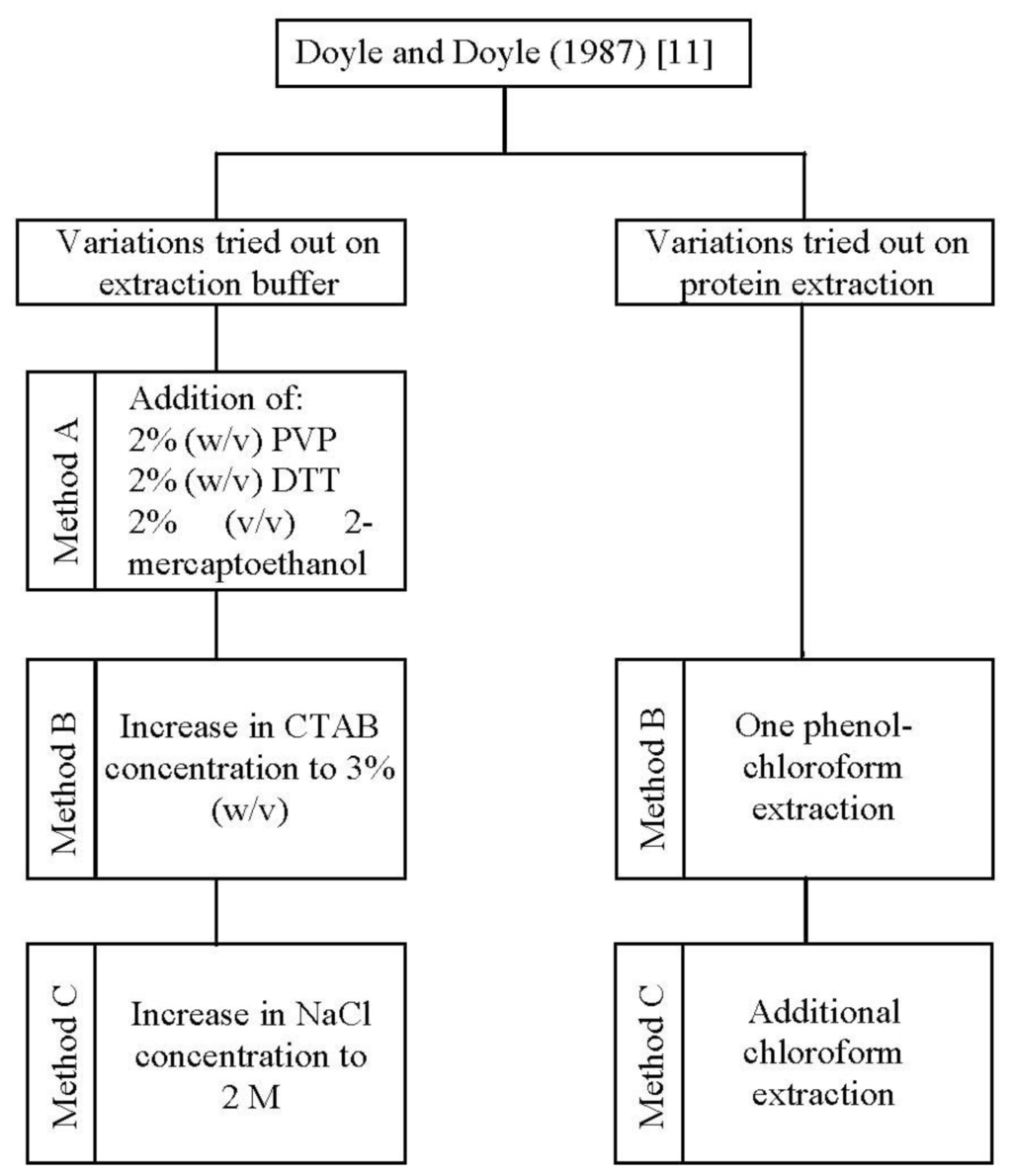 In the present study, one standard [11] and three improved methods (method A, B, and C) for DNA isolation were applied to A. unedo leaves (Figure 1).