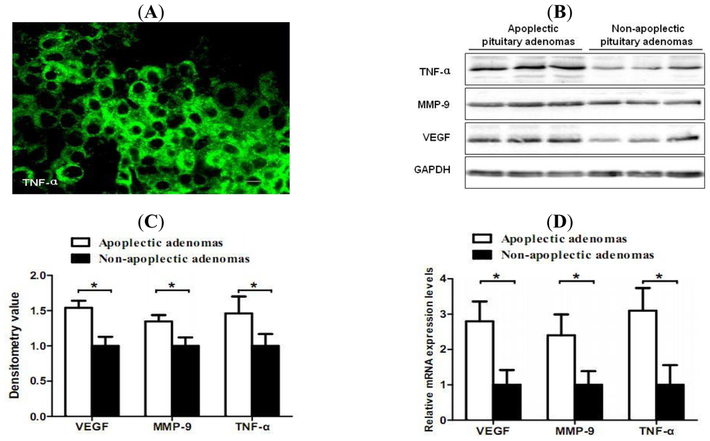 Increased expression levels of tumor necrosis factor alpha (TNF-α), vascular endothelial growth factor (VEGF) and matrix metalloproteinase-9 (MMP-9) in hemorrhagic pituitary adenomas. (A) Representative immunofluorescence staining of TNF-α. Scale bar = 5 μm; (B) Western blot results showed higher expression levels of TNF-α, VEGF and MMP-9 in hemorrhagic pituitary adenomas (P < 0.05); (C) Densitometric analysis normalized with GAPDH as loading control was also shown; (D) Real-time RT-PCR was performed with the same tissues and showed increased mRNA expression levels of TNF-α, VEGF and MMP-9 (P < 0.05). All of the bars in the figures show mean ± SD. * P < 0.05.