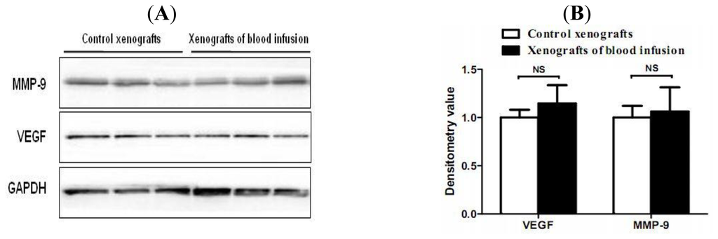 Effect of blood injection on protein expression levels of VEGF and MMP-9 in xenograft tumors. Whole blood (500 μL) or 0.9% saline was injected into subcutaneous xenograft tumors (3 tumors per condition), after two days, tumors were harvested and protein was extracted for western blot. (A) Representative western blots of xenografts from the blood injection group and the control group. No significant enhancing effect of blood injection on protein expression of VEGF and MMP-9 was observed; (B) Densitometric analysis normalized with GAPDH as loading control was also presented. Data are expressed as mean ± SEM. NS: not significant.