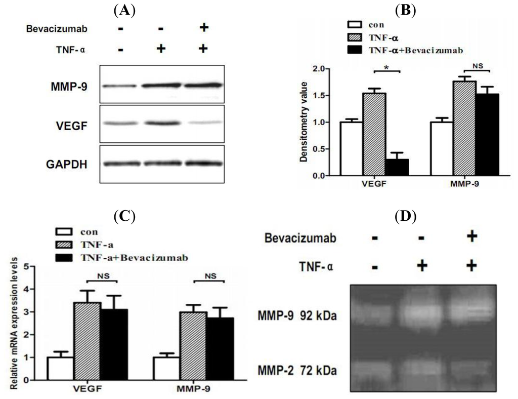 MMQ cells (1 × 106) were cultured with TNF-α (20 ng/mL) or TNF-α plus VEGF inhibitor bevacizumab (5 mg/mL) in serum free DMEM medium, after 24 h incubation, the supernatant was collected, and centrifuged at 2000 rpm for 10 min. Protein concentration was determined and electrophoresed on 7.5% non-reducing SDS–PAGE gels containing 2 mg/mL gelatin as a substrate at constant voltage. After electrophoresis, the gels were rinsed in renaturation buffer (2.5% Triton X-100) on a shaker for 30 min to remove SDS and were incubated overnight at 37 °C in a water bath in activation buffer composed of 50 mmol/L Tris-HCl (pH 7.5), 5 mmol/L CaCl2. Gels were stained using 0.5% Coomassie blue R-250 (Bio-Rad) for 2 h, followed by appropriate destaining. MMP activity was detected as a band on a dark blue background and quantified densitometrically using Image-Pro Plus.