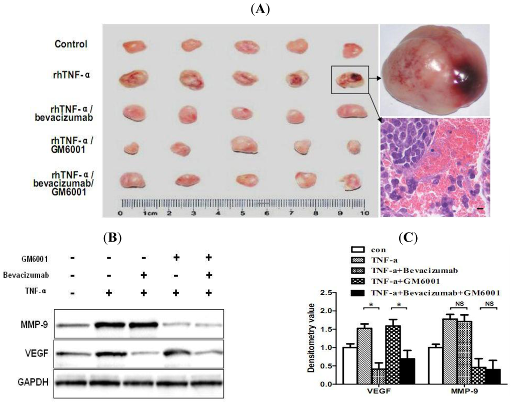 Mouse tumor hemorrhage, pathology and the expression levels of VEGF and MMP-9. Mice were implanted with MMQ cells. After two weeks, mice were treated with saline, rhTNF-α, rhTNF-α plus bevacizumab, rhTNF-α plus GM6001, rhTNF-α plus bevacizumab and GM6001. Five mice in each group. rhTNF-α (10,000 U/kg i.m.), bevacizumab (10 mg/kg i.p.) and GM6001 (10 mg/kg i.p.) were implemented twice per week. Both bevacizumab and GM6001 were administrated one week before and during TNF-α treatment. Tumors were harvested after one week rhTNF-α treatment. (A) Tumors of each group and representative pictures of hemorrhagic tumor and HE staining. Scale bar = 5 μm; (B) Protein expression levels of VEGF and MMP-9 in tumors after treatment. Western blot analysis revealed the increased VEGF expression in tumors of rhTNF-α and rhTNF-α/GM6001 treated mice and increased MMP-9 expression in those of rhTNF-α and rhTNF-α/bevacizumab treated mice. Bevacizumab inhibited VEGF expression with reduced appearance of VEGF band. GM6001 inhibited MMP-9 expression with reduced appearance of MMP-9 band. (C) Densitometric analysis of western blot results. GAPDH was an internal control to normalize gel loading. * P < 0.05. NS: not significant.