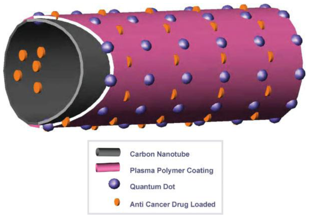 Poly (lacticco-glycolic acid) (PLGA) modified CNT conjugated with quantum dots QD (CNT-QD) exhibits a strong luminescence for in vivo imaging in the early detection and therapy of cancer []. Figure 2 is the schematic diagram for the concept of the functionalized CNT-QD as drug carriers.