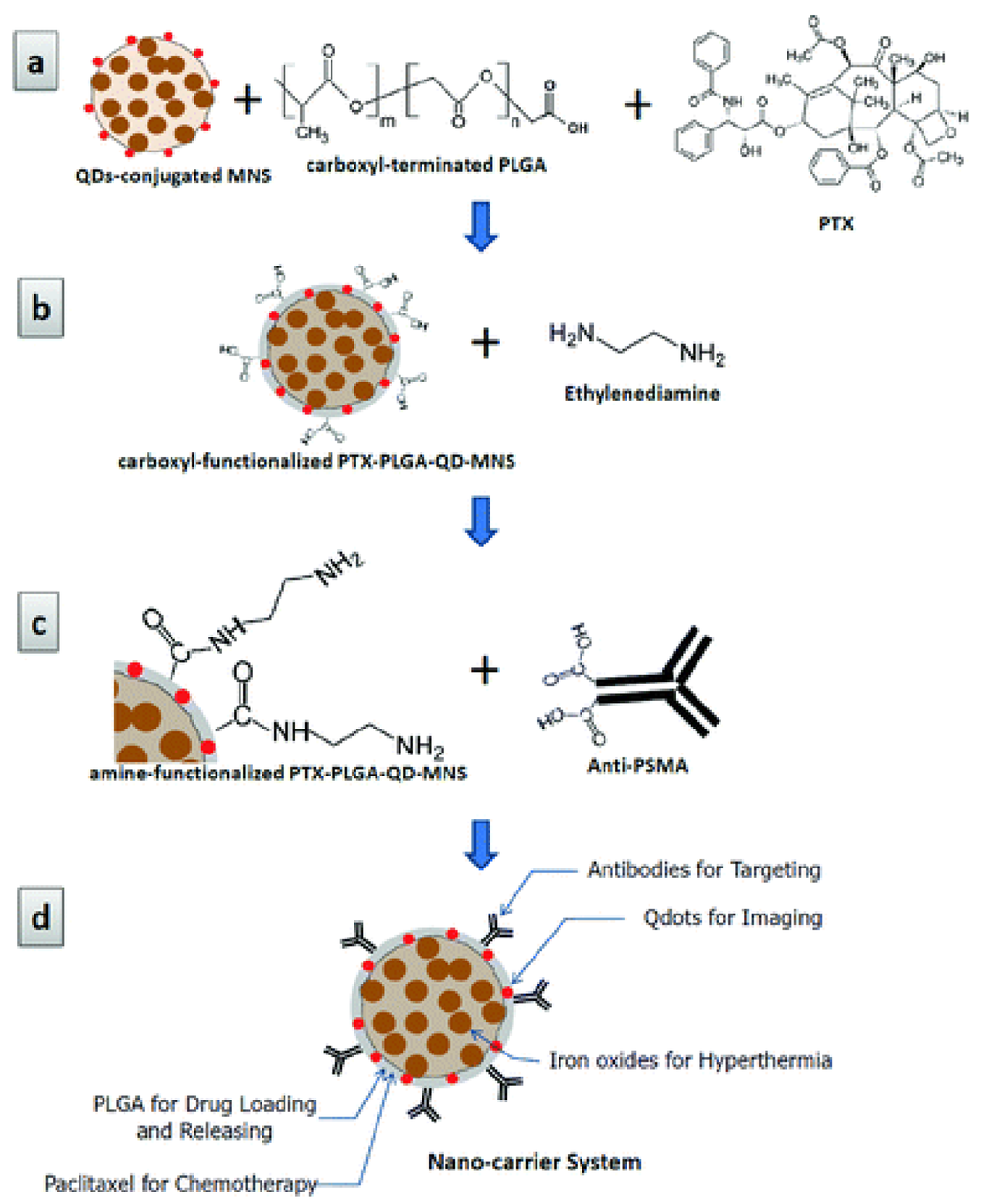 Schematic diagrams illustrating surface functionalization of superparamagnetic Fe3O4 nanoparticles: (a) carboxyl functionalization using carboxyl terminated PLGA on the surface of QD-MNSs with PTX loading; (b) amine functionalization by conjugation of ethylenediamine to the surface of carboxylate-functionalized PTX-PLGA-QD-MNSs using conventional NHS/EDC coupling method; (c) conjugation of anti-PSMA to the PTX-PLGA-QD-MNSs, and (d) new multifunctional (fluorescent imaging, targeting, hyperthermia, and chemotherapy) nanocarrier system (reproduced with permission from []© 2010, American Chemical Society).