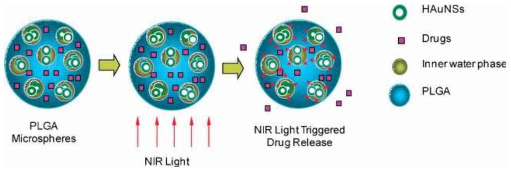 The hypothetical structure of PTX/HAuNS-MSs and the proposed release mechanism triggered by NIR-laser. PTX uniformly dispersed in the PLGA, HAuNSs are dispersed in the water phase within the microspheres (reproduced with permission from []© 2010, Wiley-VCH Verlag GmbH & Co. KGaA).