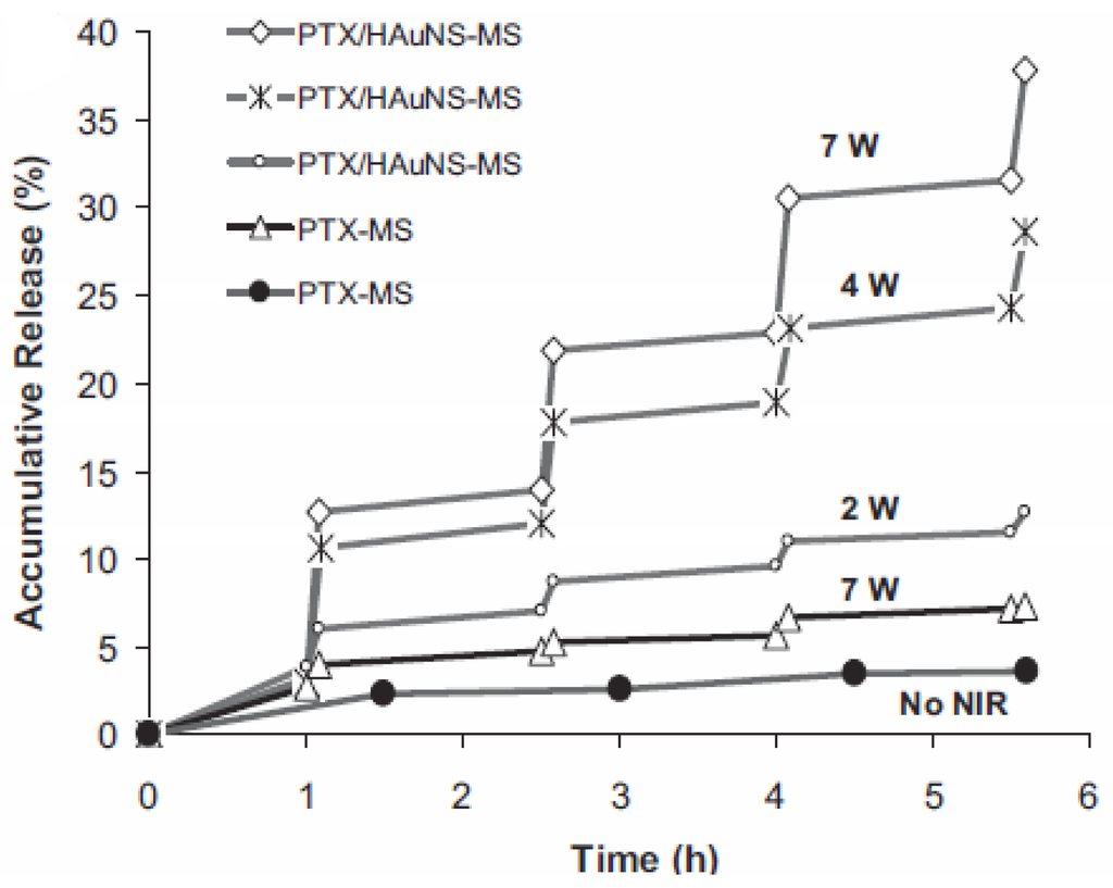 NIR-light-triggered release of PTX from PTX/HAuNS-MSs. PTX-MSs (•) without laser irradiation released only 3.6% PTX; PTX-MSs without HAuNSs released less than 7% PTX under NIR expose. The PTX/HAuNSMSs have higher release speed when exposed to NIR irradiation, but when the NIR irradiation was turned off the release speed became very low. And the total release of the PTX was cumulative according to the power of the NIR light (reproduced with permission from []© 2010, Wiley-VCH Verlag GmbH & Co. KGaA).