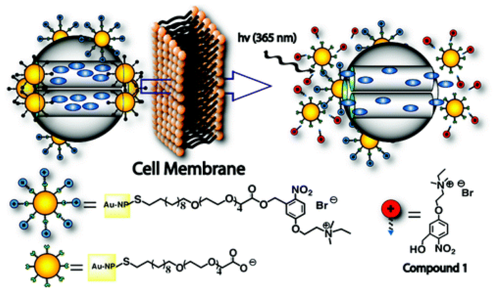A photoinduced gold nanoparticle-capped mesoporous silica nanospheres (MSNs) (PR-AuNPs-MSN) was designed as a delivery system of PTX. Under the UV irradiation, the surface charge of the gold nanoparticles was changed from positive to negative. The repulsion of the negatively charged MSN with PTX released the drug from MSN cages (see Figure 8). Combined with UV irradiation, this nanoparticles effectively decreased the cell viability [].