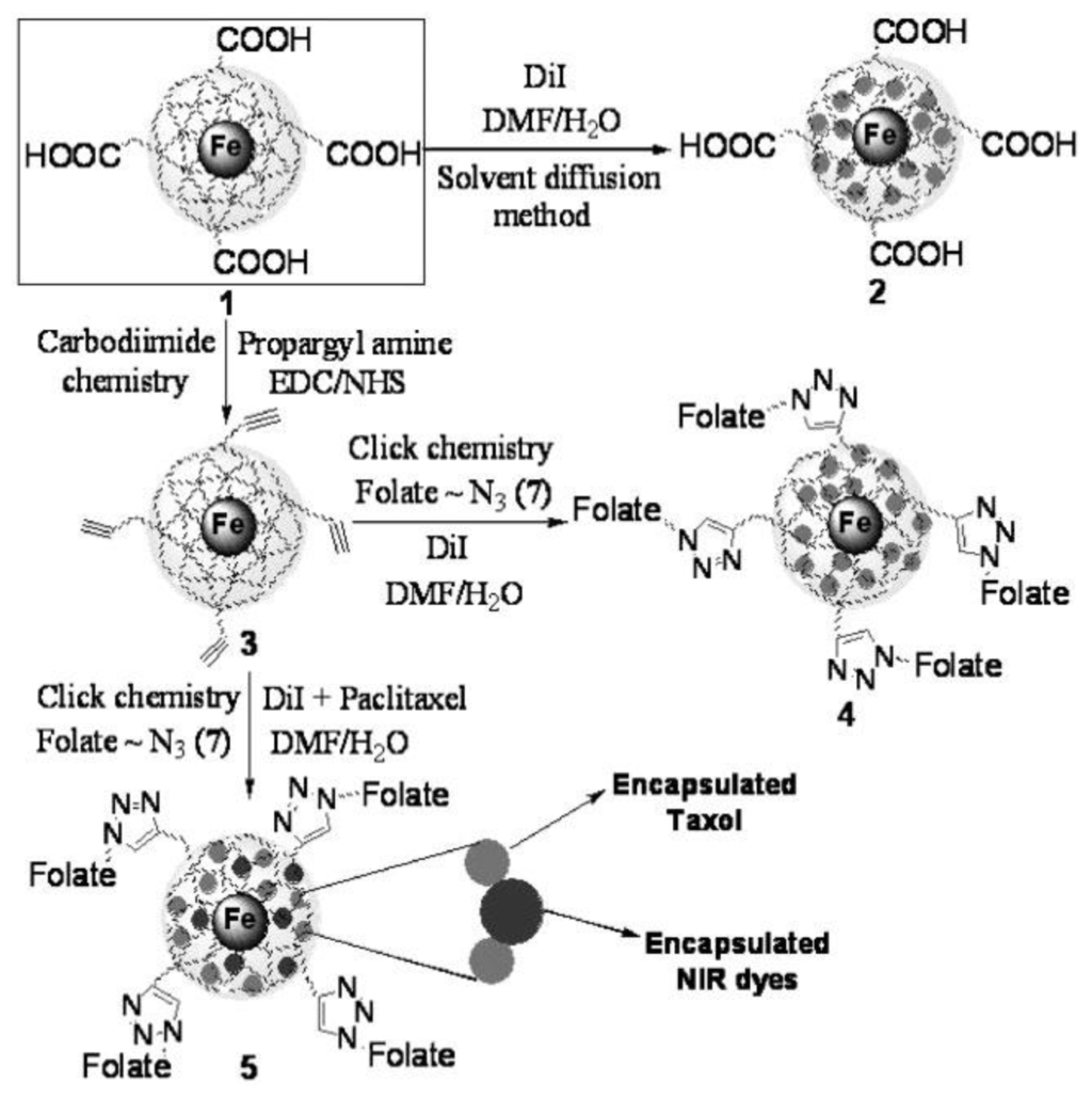 MNPs coated with hydrophilic polymers have many advantages in drug delivery applications. These NPs have high loading capacity, good dispersibilily, and excellent biocompatibility [–]. Biocompatible and biodegradable multifunctionalized superparamagnetic iron oxide nanoparticles coated with poly(acrylic acid) (PAA) were synthesized as a drug delivery system (Scheme 1) []. The anticancer drug PTX and an infrared (NIR) dye (DiI or DiR) were encapsulated in its polymeric matrix. The targeting molecule folate was conjugated on the nanoparticle via highly selective 1,3-dipolar cycloaddition reaction. The nanoparticles can not only deliver drugs to the tumor target, but also offer fluorescent and MRI imaging capabilities. The DiI fluorescence indicated that the lung carcinoma A549 cells internalized the targeting NP that induced cell death (4). The carboxylated (2) and the folate-functionalized NPs were not significantly taken up by cells (5). There was no significant drug release from this system in PBS. Upon incubation with esterase at pH 7.4, the release was nearly 90% within 2 hrs. At pH 4.0, it needs only 30 min [].