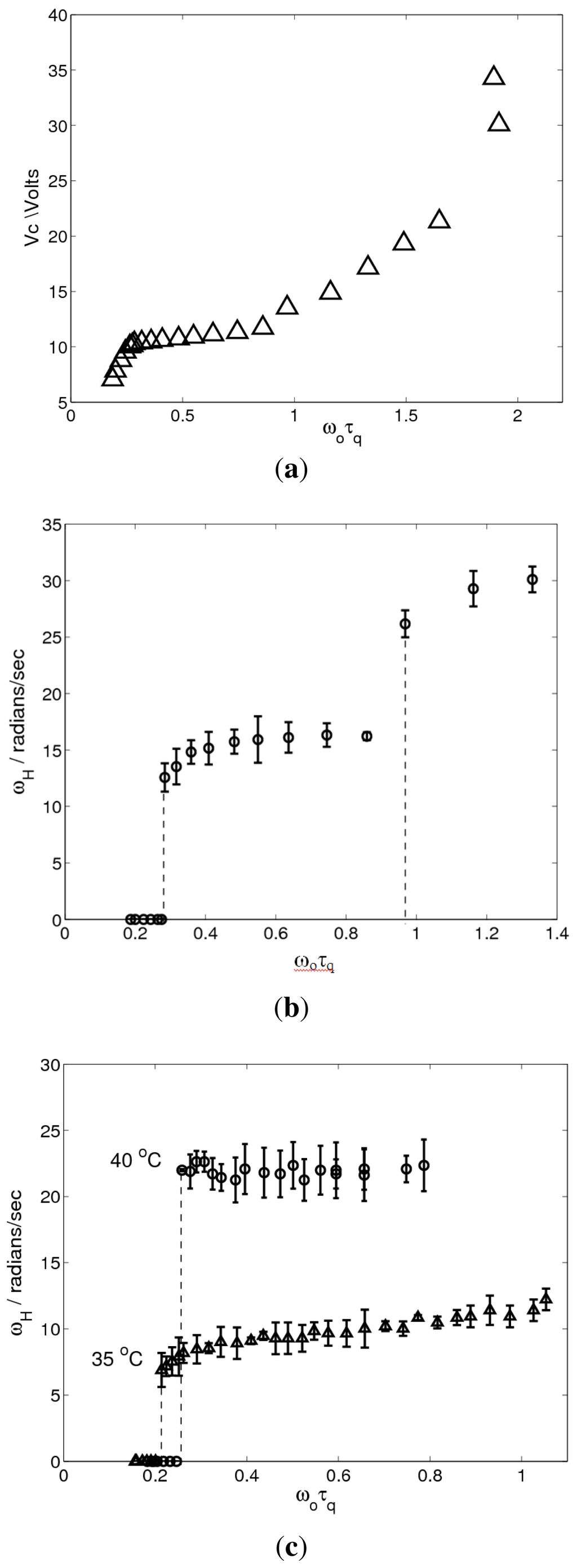 (a) Threshold curve Vc and (b) circular frequency ωH versus ω0τq for cell A at 35 °C. In (c) ωH is shown for cell B at 35 °C and 40 °C. The vertical dashed lines in (b) and (c) mark discontinuous jumps.