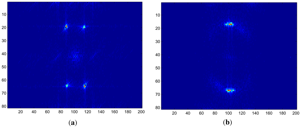 (a) and (b): Amplitude of Fourier transform of the images depicted in Figure 3(a), (b), respectively, into regions showing the dominant first harmonics.