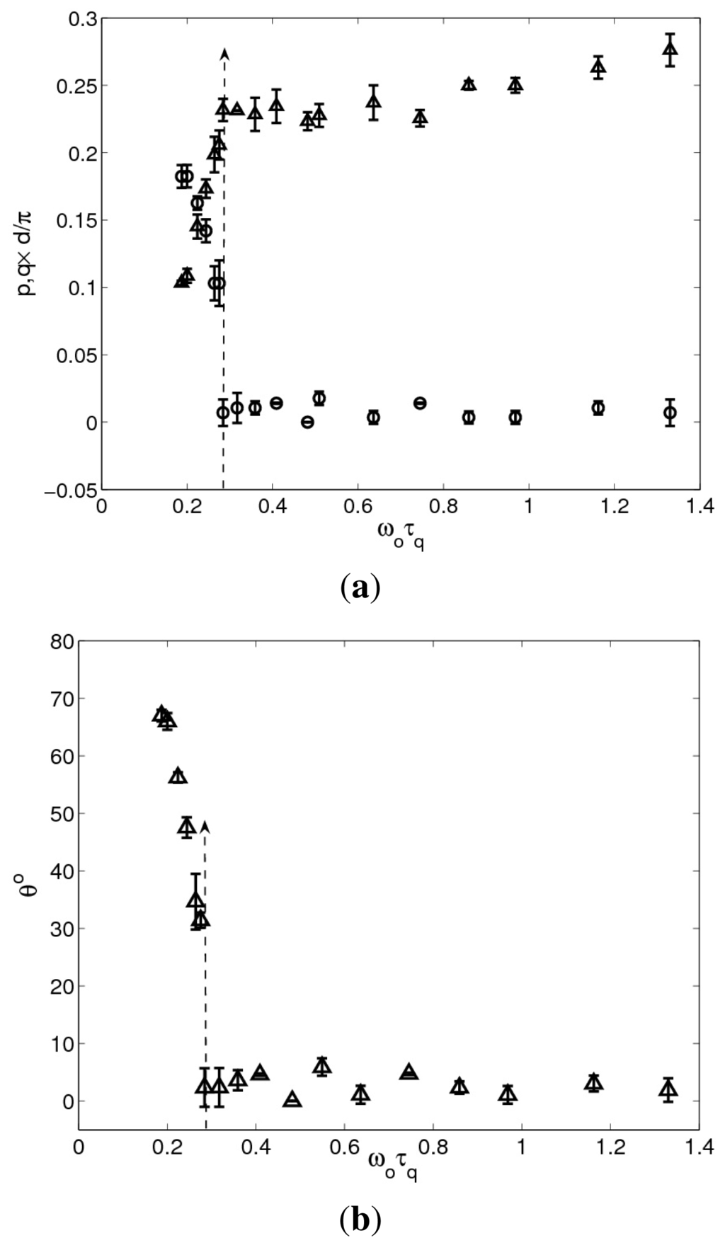 with ω0τq are shown in Figure 5(a, b), respectively. In these plots we can see jumps in <q> and θ at ω0τq ≈ 0.28 from nonzero to zero values, showing that there is a transition from oblique to normal rolls. Notice that in the oblique regime <p> and <q> show a relatively strong variation with the driving frequency, whereas in the normal regime there is little variation. In addition to this strong variation in the average wave numbers, there is also a strong variation of σ⊥ and ε ⊥ (but not a discontinuity) in the oblique regime, see Figure 6.