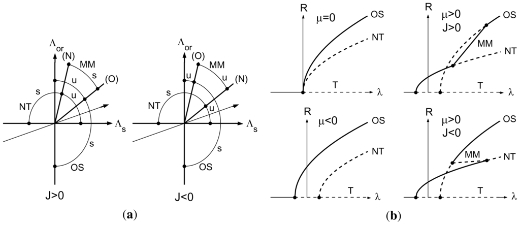 (a) Stability diagrams showing existence and stability regions (s: stable, u: unstable) of OS, NT, and MM in the (Λs, Λor)-plane in the case of (8), (9), and dr < 0, cr < 0. The straight arrow pointing from the third to the first quadrant corresponds to the path traversed for μ = 0 when λ increases from negative to positive values and (14) holds. (b) Sketch of bifurcation diagrams of OS, NT, and MM for fixed μ = 0, μ < 0 and μ > 0 with J < 0 and J > 0 in the case of (8), (9), (14), (15) and b1r > aor. Stable and unstable branches are marked solid and dashed, respectively.