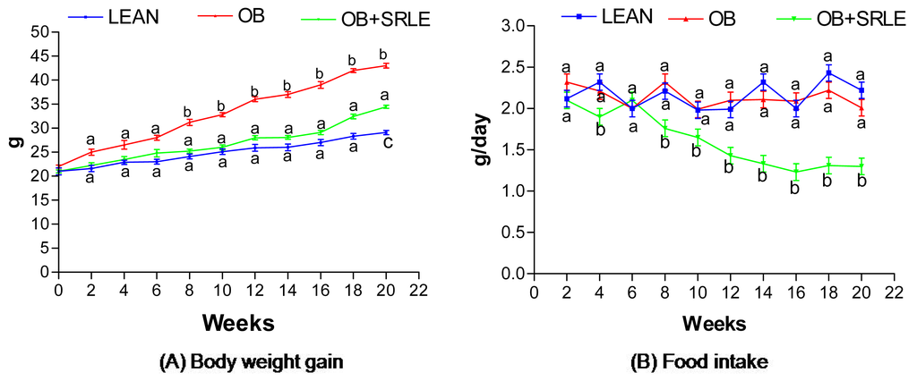 Effect of S. rhomboidea. Roxb leaf extract feeding on (A) body weight gain and (B) food intake. Results are expressed as mean ± S.E.M., n = 6. Where, time points not sharing common letter indicate significant differences (p < 0.05).