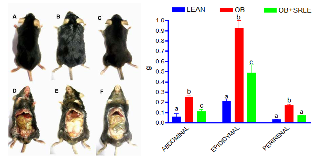 Visceral adiposity was evident in the form of increase in various fat pad weights (Perirenal, abdominal and epididymal) in OB mice after 20 weeks of HFD feeding (Figure 2). OB mice supplemented with SRLE extract showed significant attenuation in HFD induced visceral adiposity and increment in fat pad weights (Figure 2).