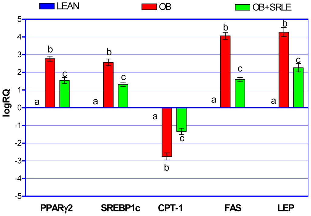 HFD fed OB mice recorded significantly up-regulated mRNA expression of PPARγ2, SREBP1c, FAS and LEP, while CPT-1 expression was significantly down-regulated in epididymal fat pad compared to lean mice. However, these set of changes were significantly prevented in SRLE supplemented OB mice (Figure 3).