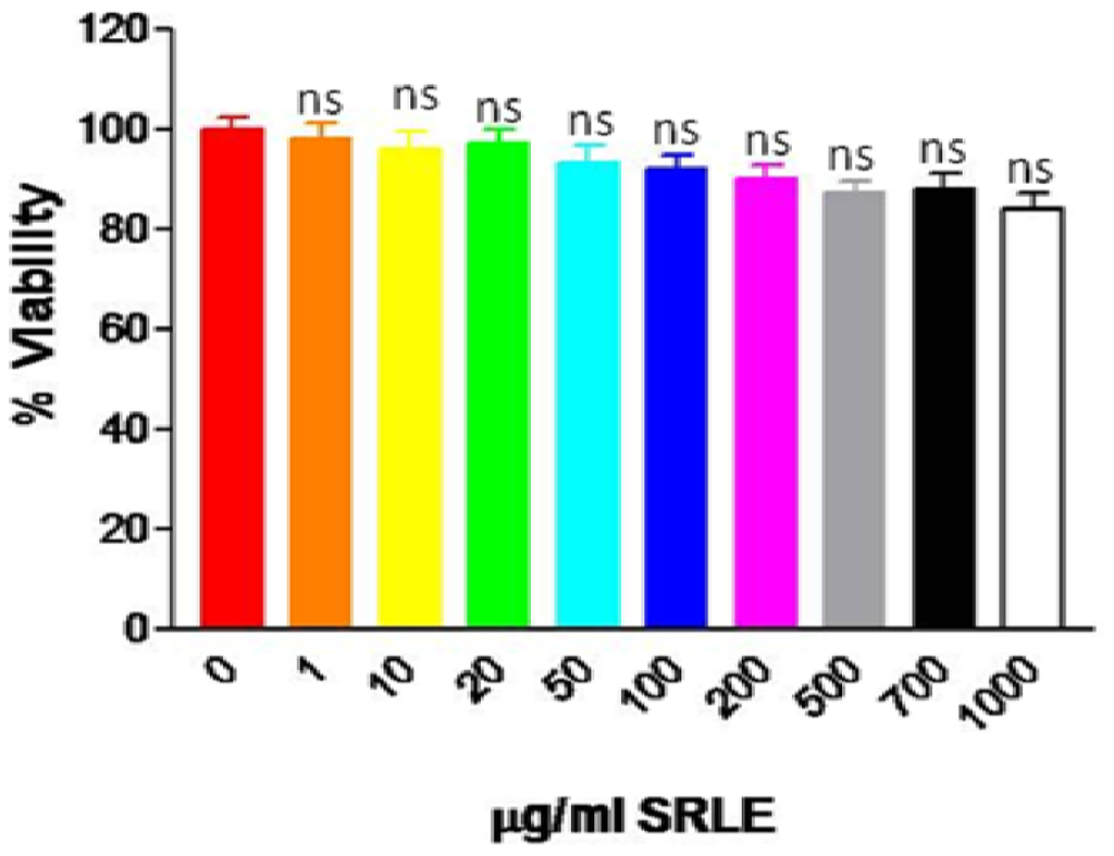 Effect of S.rhomboidea.Roxb leaf extract on cell viability. Results are expressed as mean ± S.E.M., n = 3. Where, * P < 0.05, ** P < 0.01 and P < 0.001 and ns non significant compared to 0 μg/mL SRLE.