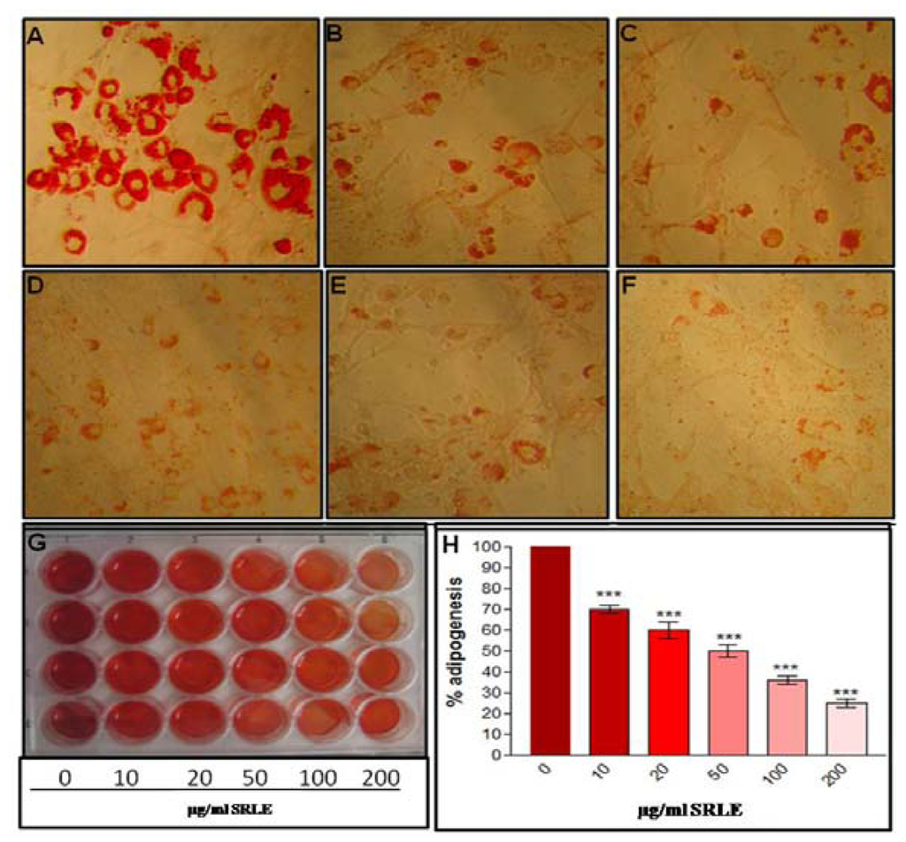 Photomicrograph of Oil Red O stained differentiating 3T3L1 cells (A) untreated, (B) treated with 10 μg/mL SRLE, (C) treated with 20 μg/mL SRLE, (D) treated with 50 μg/mL SRLE, (E) treated with 100 μg/mL SRLE and (F) treated with 200 μg/mL SRLE and qualitative (whole well image of Oil Red O stained adipocytes) and quantitative (% adipogenesis) evaluation of adipocyte differentiation (G and H). Results are expressed as mean ± S.E.M., n = 3. Where, * P < 0.05, ** P < 0.01 and P < 0.001 and ns non significant compared to 0 μg/mL SRLE.