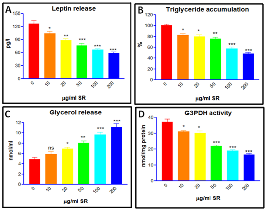 3T3-L1 pre-adipocytes were differentiated as described above for 12 days. For glycerol release assay, differentiated adipocytes were incubated with SRLE (10–200 μg/mL) or vehicle (0.9% NaCl) for 48 h. At the end of incubation, supernatant was collected from each well and glycerol content was determined by spectrophotometric assay [].