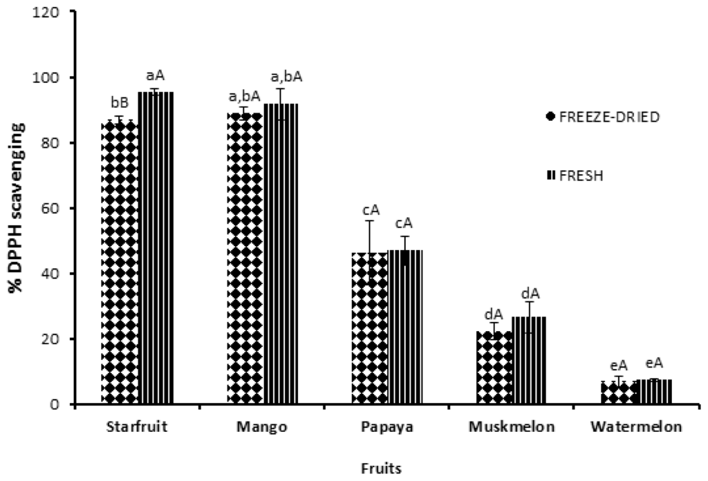 The results from the study (Table 2) showed that TPC of fresh and freeze-dried fruits tested varied significantly (p < 0.05) ranging from 14 to 181 mg GAE/100 g sample FW. Fresh starfruit (181.71 mg GAE/100 g FW) was found to have the highest TPC, followed by fresh mango (99.69 mg GAE/100 g FW), papaya (67.76 mg GAE/100 g FW), watermelon (29.32 ± mg GAE/100 g FW) and muskmelon (16.71 mg GAE/100 g FW). TPC values reported by other researchers for selected tropical fruits varied from the values obtained in this study, Reporting the following findings:total phenolics content of acidic starfruit (142.9 mg GAE/100 g FW) and sweet starfruit (209.9 mg GAE/100 g FW), mango (56.0 mg GAE/100 g FW) and papaya (57.6 mg GAE/100 g FW) [18]. Meanwhile, a higher TPC was reported in mango (113 mg GAE/100 g FW) but lower in papaya (54 mg GAE/100 g FW) than the present analysis [10]. However, TPC of mango in another study was determined to be 266 mg GAE/100 g FW, significantly higher than our data [19]. There was no available data on TPC of fresh muskmelon (16.71 mg GAE/100 g FW) and watermelon (29.32 mg GAE/100 g FW). Fresh starfruit contained comparable TPC with that of other tropical fruits such as banana (52–231 mg GAE/100 g) and pineapple (47–174 mg GAE/100 g) [19,20], however, the amount was still lower than that reported in blackberry (417–555 mg GAE/100 g FW).