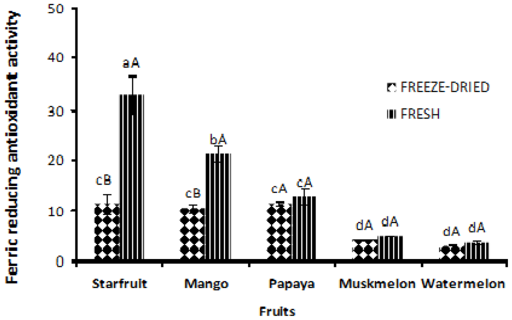 Ferric reducing antioxidant power (FRAP) assay measures the total reducing capacity of a compound, based on its ability to reduce Fe3+/tripyridyltriazine complex to its blue-colored ferrous form. The results of the present study showed that fresh starfruit exhibited the highest FRAP value of 33.04 μmol TE/g FW (Figure 2). On the other hand, it was noted that fresh and freeze-dried muskmelon as well as watermelon showed the lowest FRAP value revealing no significant (p > 0.05) difference between the fruits. Fresh starfruit and mango exhibited significantly (p < 0.05) higher FRAP values as compared with that of freeze-dried samples. However, there was no significant (p > 0.05) difference in FRAP values between the fresh and freeze-dried papaya, muskmelon and watermelon. A fairly similar trend was seen in the case of FRAP as was reported for that of the DPPH assay. FRAP assay is more suitable for determining the antioxidant activity of water and lipid-soluble components [38].