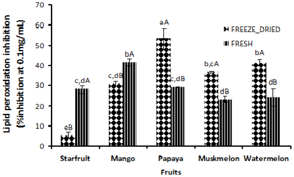 The conjugated diene assay measures the ability of antioxidant to inhibit the peroxidation of linoleic acid. In the present study, fresh starfruit (28.2%) and mango (41.5%) exhibited significantly (p < 0.05) higher magnitudes of lipid peroxidation inhibition than those of freeze-dried samples (5.28% and 30.92%, respectively) (Figure 3). However, interestingly, freeze-dried papaya (53.3%), muskmelon (36.7%) and watermelon (41.2%) showed significantly (p < 0.05) higher antioxidant activity compared to those of fresh samples (29.1%, 23.4% and 24.0%, respectively). As expected, all fruits exhibited a low level of inhibition activity when compared to that of α-tocopherol and BHA (at 0.1 mg/mL), with the inhibition of peroxidation being 87.98% and 98.20%, respectively. The measurement of lipid peroxidation inhibition by employing a conjugated diene assay is useful to assess the antioxidant activity of plant materials. Soybean extracts showed lipid peroxidation inhibition of 55.0% at 1 mg/mL [43] whereas at 5 mg/mL, Taiwan mushroom inhibited peroxidation by 65.2% [44] using conjugated diene assay.
