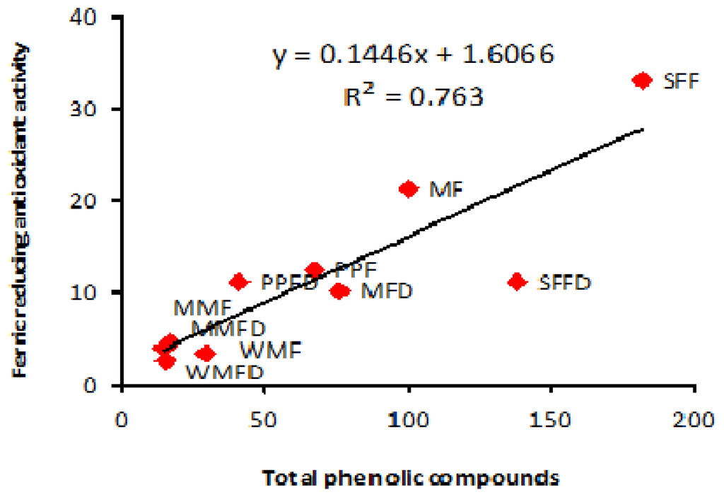 Correlation between ferric reducing antioxidant activity and total phenolic compounds of selected fruits.SFFD: starfruit freeze-dried; SFF: starfruit fresh; MFD: mango freeze-dried; MF: mango fresh; PPFD: papaya freeze-dried; PPF: papaya fresh; MMFD: muskmelon freeze-dried; MMF: muskmelon fresh; WMFD: watermelon freeze-dried; WMF: watermelon fresh.