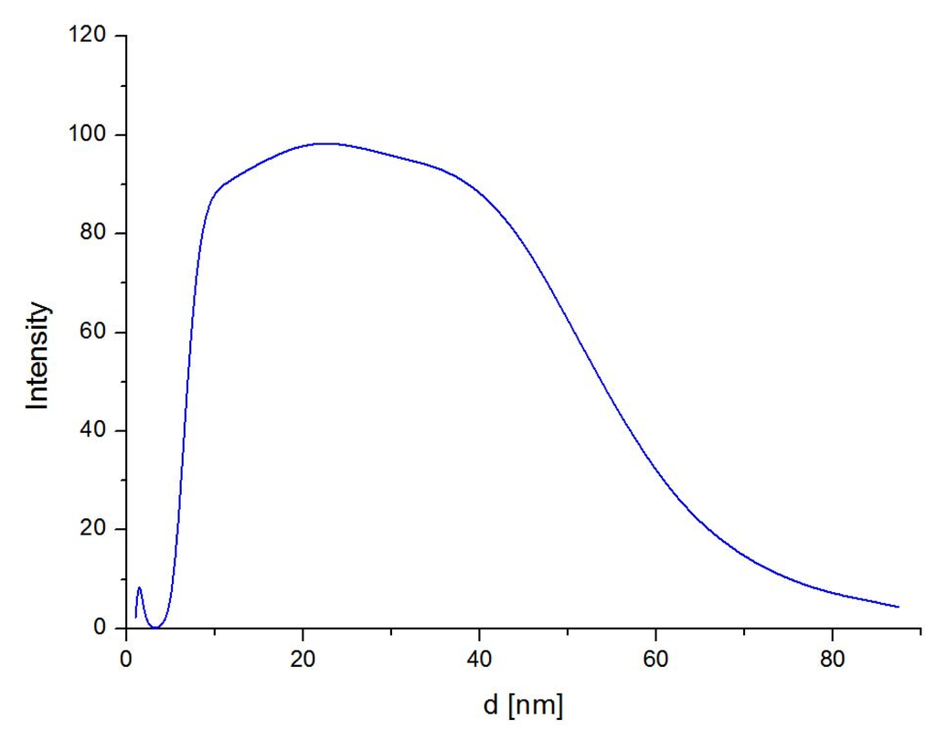 Measurements using dynamic light scattering (DLS) for colloidal solutions of 30 ppm AgNPs showed an average NP size of 22.8 nm. The size distribution of AgNPs is presented in Figure 1.