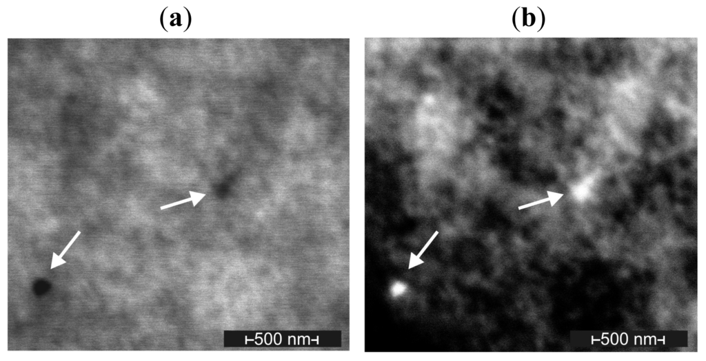 Micrographs showing AgNPs in a composite with 160 ppm AgNPs. Scanning transmission electron image using (a) the wet-STEM detector and (b) the gaseous secondary electron detector (GSED).