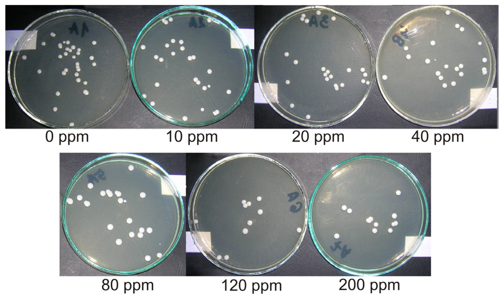 Antifungal test results are presented in Table 1 and Figure 4. Positive and negative controls yielded expected results. For material specimens without AgNPs, the observed Candida albicans CFU/mL value increased by 23.4% compared with the positive control. The introduction of 10 ppm AgNPs to the polymer led to an antifungal efficacy (AFE) of 16.4%. Increasing the AgNP concentration in the composite to 20 ppm resulted in an additional increase in the AFE of 8%. The average AFE value for samples with 40 ppm AgNPs was 31.5%. An additional increase in the AgNP concentration resulted in a less dynamic, but still visible, AFE increase. For the highest examined AgNP concentration (200 ppm), the maximum composite AFE value reached was 52.2%.
