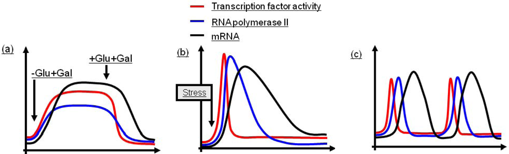 Living cells need to adjust gene transcription according to diverse internal and external parameters. These signals are transmitted to the nucleus by various pathways where they trigger changes in gene expression. In principle, regulated transcription of RNA polymerase II (RNA Pol II) dependent genes can be categorized into three different patterns according to the type of inducing signals (reviewed in []). As shown in Figure 1, these are sustained transcription, single pulses and oscillations. Induced sustained transcription patterns switch expression of repressed genes more or less rapidly to an induced state and occur frequently during changes of metabolic programs (Figure 1A). A classic example is the regulation of the yeast GAL1/10 locus encoding products required for galactose metabolism. GAL1 transcription is upregulated and sustained as long as galactose is available and glucose is absent. In contrast, induced single pulse responses occur when cells encounter environmental stress such as high external osmolarity or heat shock. In these situations, transcripts are rapidly induced followed by adaptation and reduction to basal levels (Figure 1B) []. Finally, oscillatory expression patterns are characterized by periodic transcription and can be found in genes regulated by cell cycle and circadian rhythm (Figure 1C). In this review we focus primarily on the role of chromatin for regulation on the level of transcriptional initiation and elongation of single pulsed regulated and sustained induced genes in yeast.