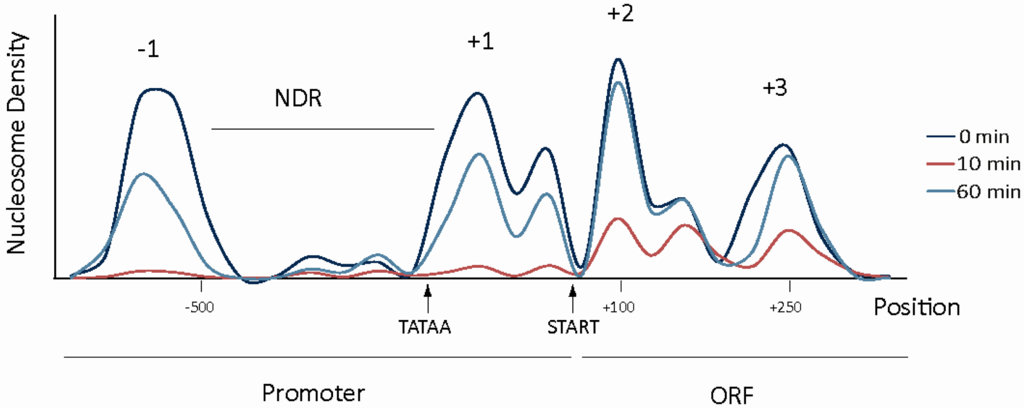 Nucleosome positions at the stress inducible CTT1 locus: The schematic representation shows 4 positioned nucleosomes. During uninduced conditions, two (−1 and +1) are flanking the nucleosome depleted region (NDR) and belong to the promoter, whereas nucleosomes +2 and +3 are positioned at the 5’ end of the 1.7 kb long ORF (dark blue line). After induction by hyperosmolarity stress for 10 min (red line) nucleosome levels are severely depleted in the entire region, after 60 min (light blue line) chromatin structure at the ORF reaches uninduced levels whereas promoter nucleosomes are not completely reassociated.