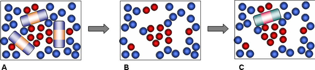 Schematic depiction of the general simulation strategy. (A) Pre-polymerization stage: Template species (red and blue striped cylinders) are mixed with functional monomers and other components of the mixture (blue and red particles); (B) Polymerization stage: molecules are frozen in their respective positions and orientations, and the template molecules are removed; (C) Adsorption stage: the porous matrix generated at the previous stage serves as a model molecularly imprinted polymer (MIP) in adsorption simulation, where it rebinds the template or adsorbs a close structural analogue (cyan and pink striped cylinder).