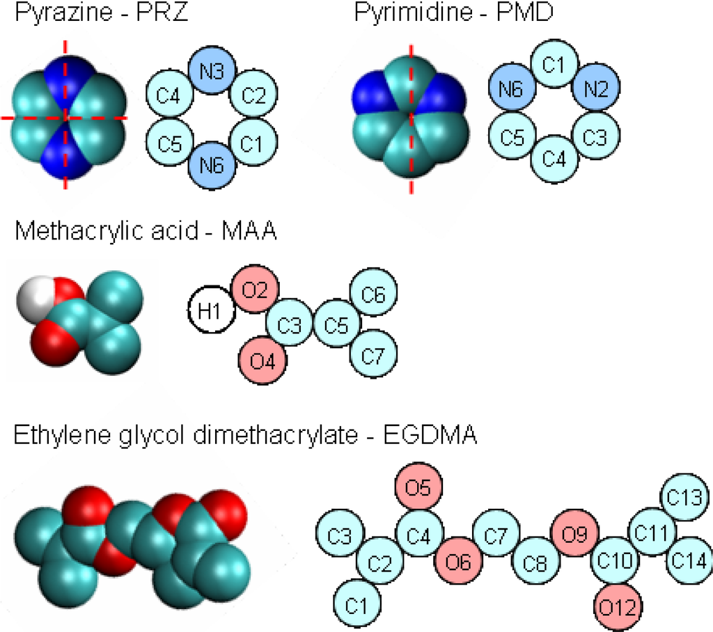 In this article we consider MAA/EGDMA systems templated with either pyrazine (PRZ) or pyrimidine (PMD). One may view the selected templates as ideal species for the simulation studies of imprinting and molecular recognition effects. They are simple and rigid, and differ only in the interaction pattern (i.e., in the location of the nitrogen atoms). The goal is to verify whether atomistic models of MIPs, imprinted with these molecules, are capable of molecular recognition. This would manifest itself in pyrazine templated material being able to preferentially adsorb pyrazine over pyrimidine, and vice versa, pyrimidine templated structure should exhibit selectivity towards pyrimidine with respect to pyrazine.