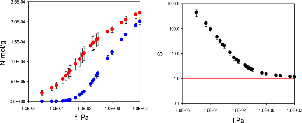 Left graph: adsorption isotherms N (mol/g) for PRZ (red circles) and PMD (blue circles) in MIP_PRZ material as a function of fugacity f (Pa) at 298 K. Right graph: separation factor S (PRZ/PMD), defined in the text, as a function of fugacity f (Pa) in MIP_PRZ material at 298 K. Note the logarithmic scale for the separation factor on the right. The red line on the right corresponds to S = 1 (no selectivity).