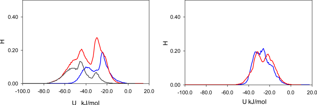 Fugacity of f = 0.1 Pa corresponds to an intermediate loading and in this regime, the energy histograms reflect filling both specific and non-specific binding sites. The specific binding sites should be occupied first on the adsorption isotherm and to describe this process, we add black lines to the left-hand graphs in Figure 5, 6 and 7 corresponding to the energy distributions for PRZ adsorbing in MIP_PRZ at a low value of fugacity f = 5 × 10−4 Pa. These distributions now reflect the range of interaction energies at very low loadings where primarily specific binding sites are occupied. In this regime, the total energy of interaction is shifted to much lower values and it is the Coulombic contribution that is responsible for this shift.