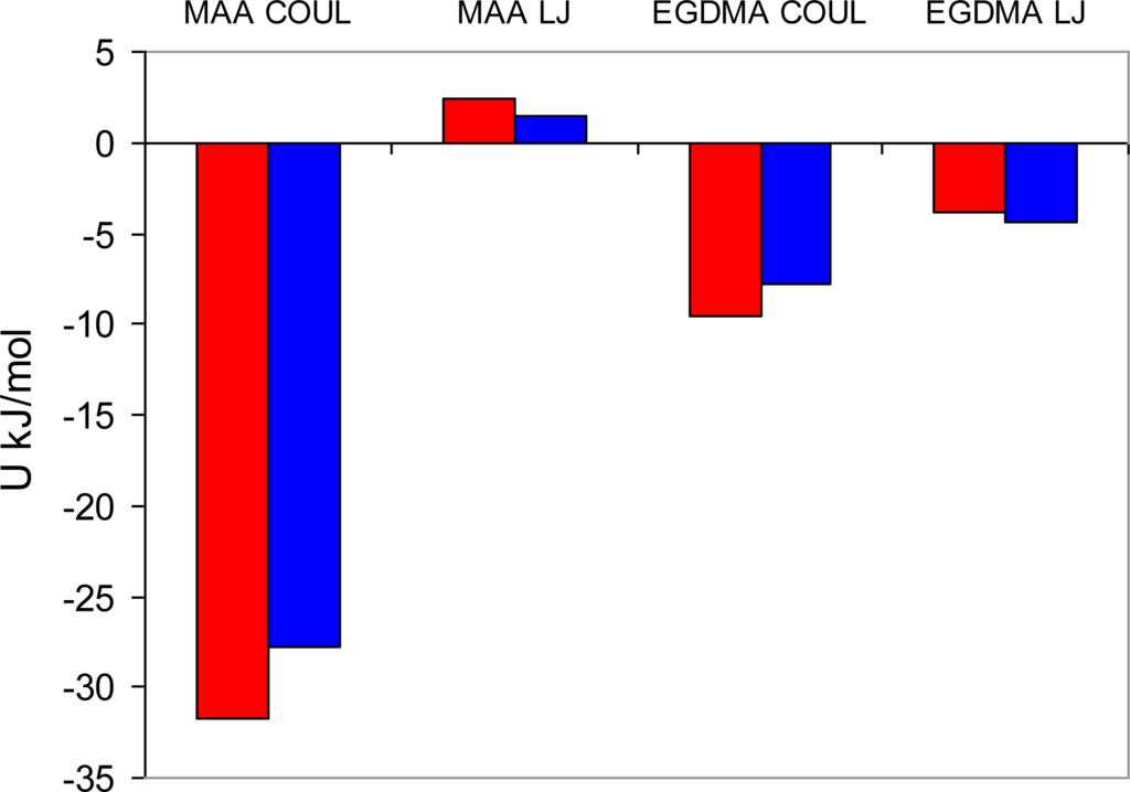 The difference in the extent of complexation in the MIP_PRZ and MIP_PMD pre-polymerization mixtures can alternatively be explored through the analysis of various energy terms in the system. Figure 13 summarizes Coulombic and Lennard-Jones energy contributions observed on average between a single molecule of the template and two other components of the mixture for the two systems of interest. This distribution is clearly very different from that in Figure 9, since it describes processes in solution. The Lennard-Jones terms corresponding to either interaction with MAA or EGDMA, are similar for both templates and are governed mostly by the overall density of the system, rather than by specific interactions. Much higher concentration of EGDMA, compared to MAA, makes the Lennard-Jones term associated with EGDMA the most significant contribution to the total potential energy of interaction between a template molecule and the rest of the system. Some signature of more specific complexation can be seen in the behavior of the Coulombic terms, with PRZ exhibiting stronger interaction with both MAA and EGDMA, compared to PMD. This is a result of a higher degree of complexation in the system with PRZ and stronger interactions within complexes, involving PRZ.