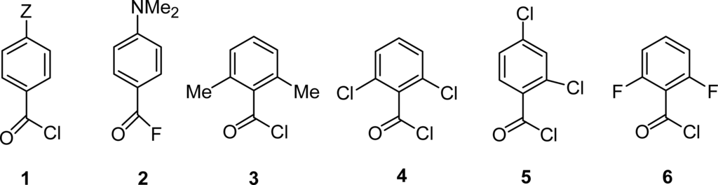 - Park, KH; Kevill, DN. The importance of the ortho effect in the solvolyses of 2,6-difluorobenzoyl chloride. J Phys Org Chem 2011. [Google Scholar] [CrossRef]